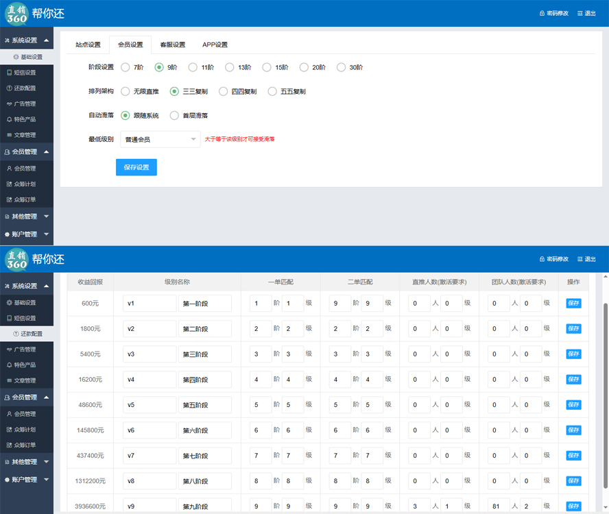 本套直销软件采用:PHP7.0+MYSQL环境,是一套创客帮你还三三复制互助直销软件,H5手机端,可以打包APP,具体的玩法请看制度说明。
